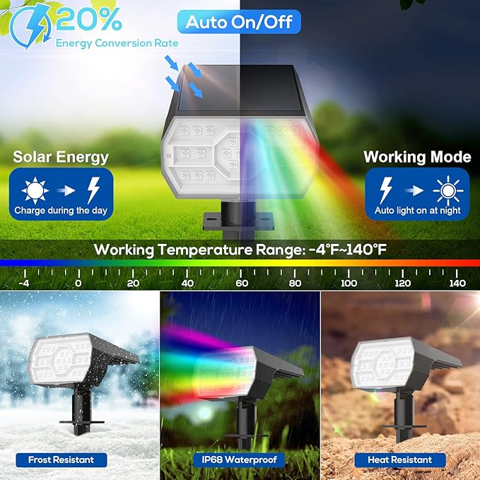 The RGB color-changing feature brings vibrant ambiance to outdoor spaces, enhancing gardens, pathways, patios, and landscape features. With adjustable light angles, you can easily highlight specific areas and create visual depth in your outdoor environment.